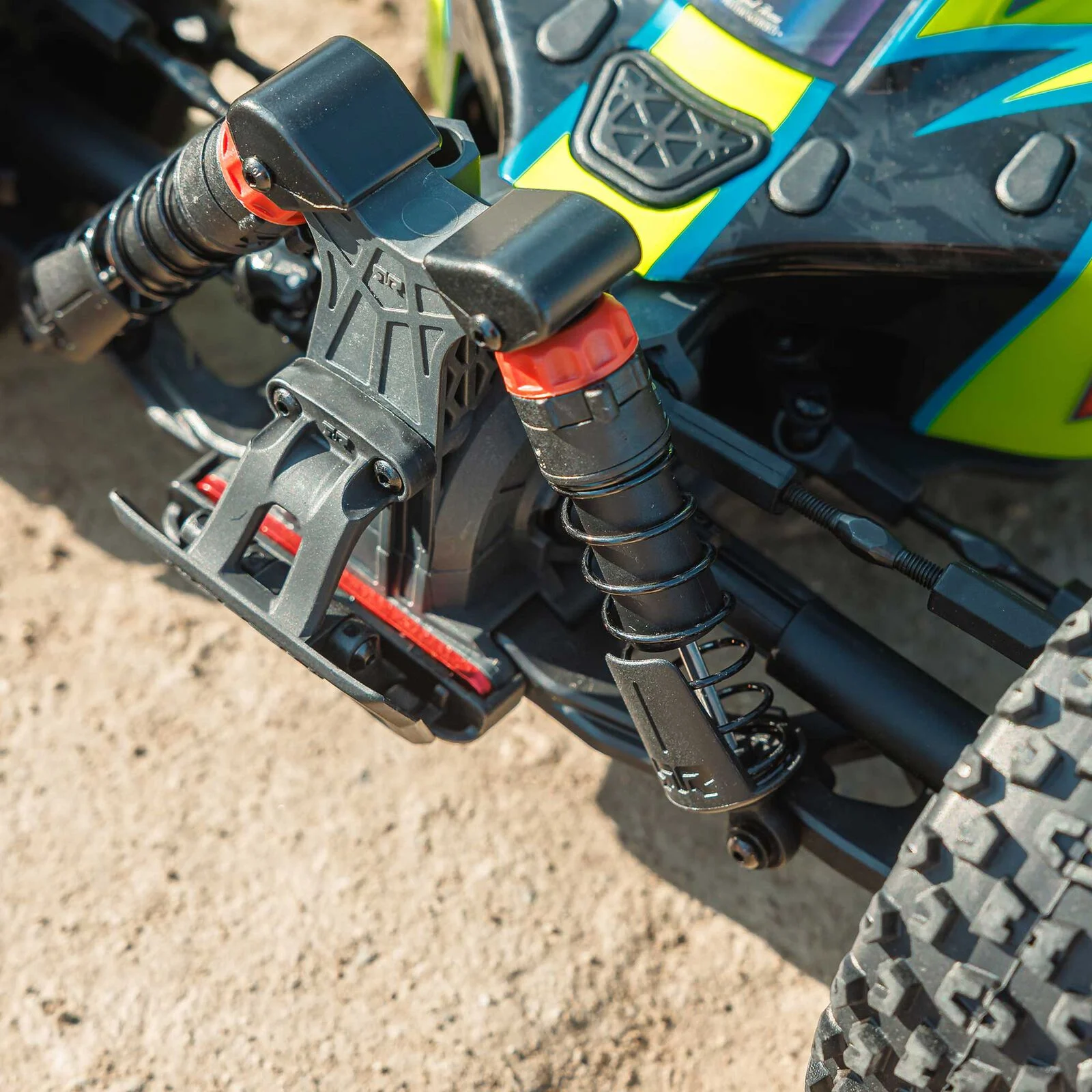 All-metal diff outdrives and gearbox internals, plus durable composite slider driveshafts, contribute to a reliable, heavy-duty 4X4 drivetrain that holds up to extreme brushless bashing. The all-terrain suspension package and adjustable, oil-filled shocks mounted on composite shock towers soak up the bumps as the TYPHON 223S BLX blasts over dirt, asphalt and grass.